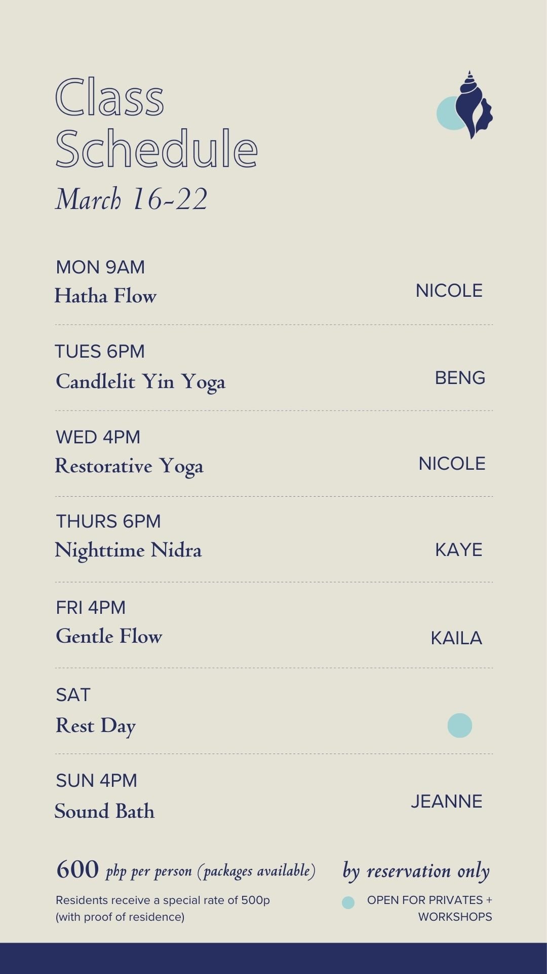 Shala opens 20min before class for settling in and payment. Gate closes at class start.