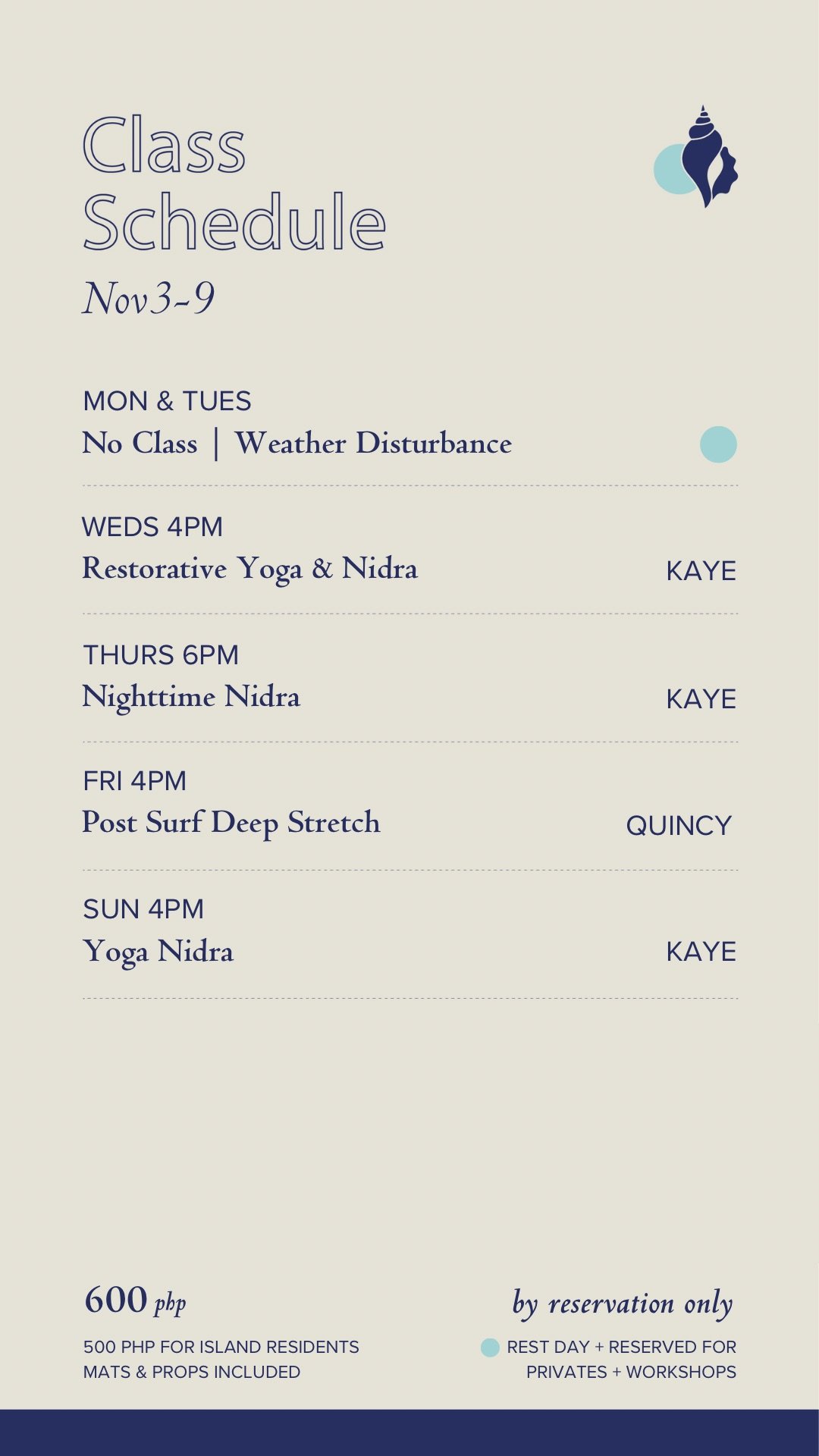 Shala opens 20min before class for settling in and payment. Gate closes at class start.