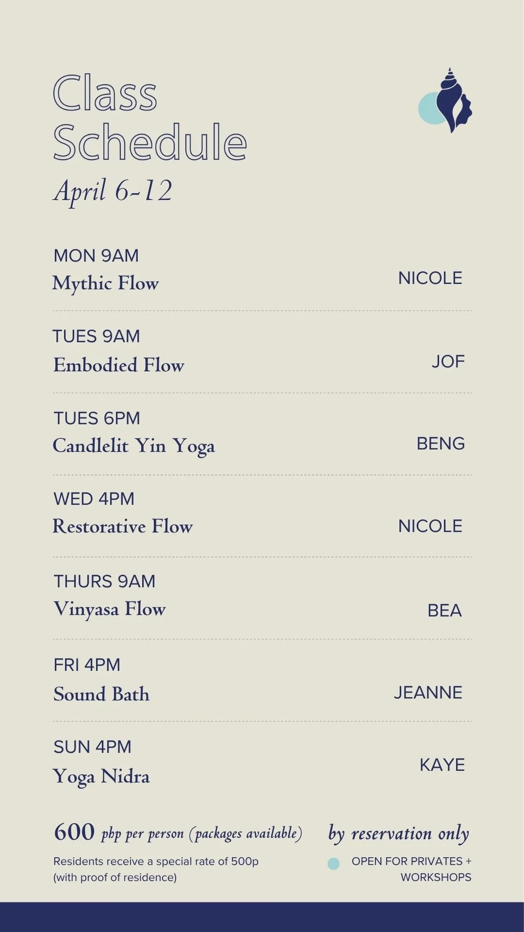 Shala opens 20min before class for settling in and payment. Gate closes at class start.
